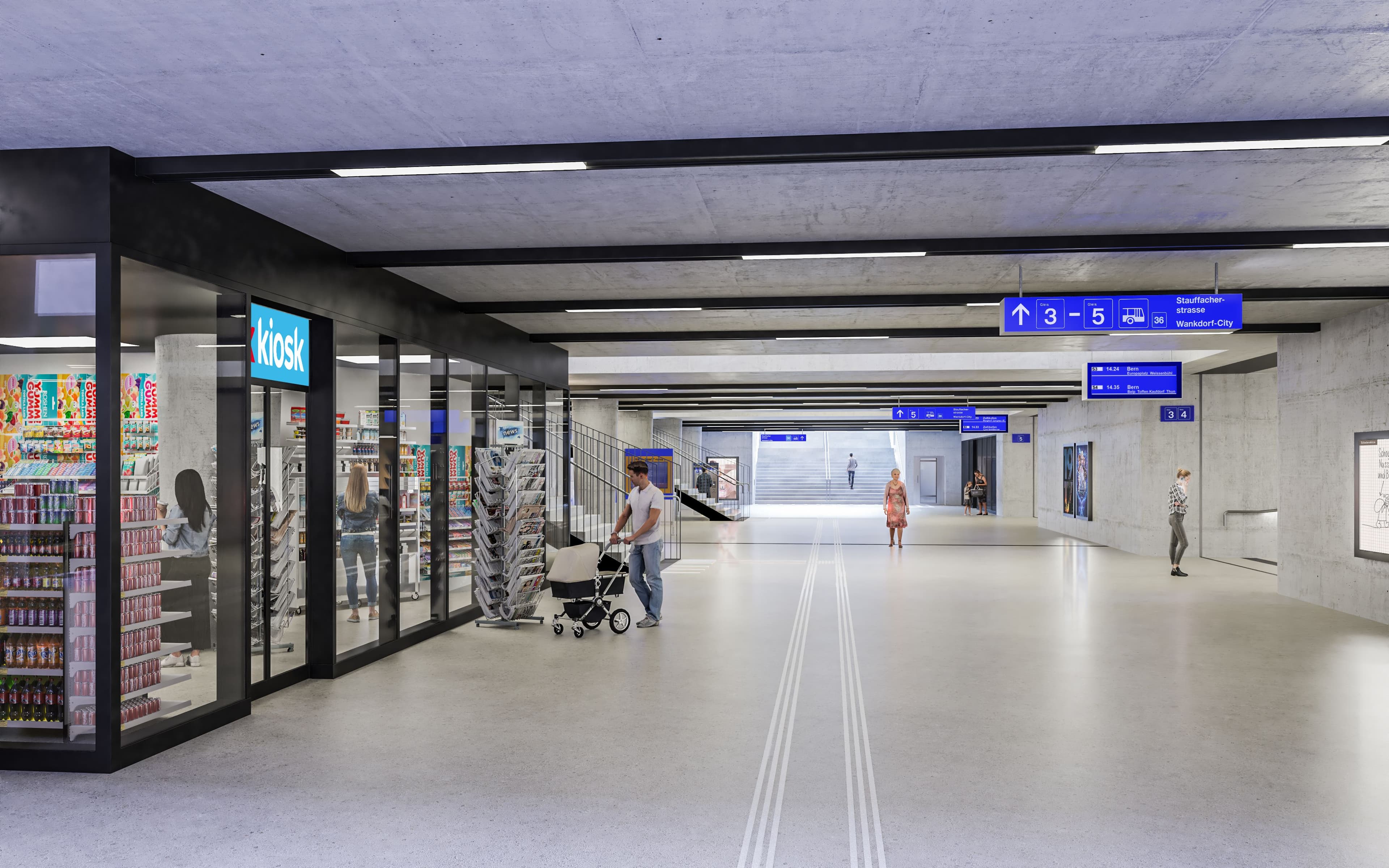 Parts of the Wankdorf Nord station will reach capacity limits over the next ten years due to development of the Bern Wankdorf area. Urgent action also needs to be taken to remedy the poor structural condition of the station. The existing main passageway is just one example of this.