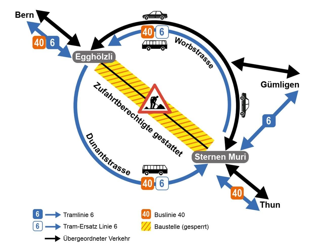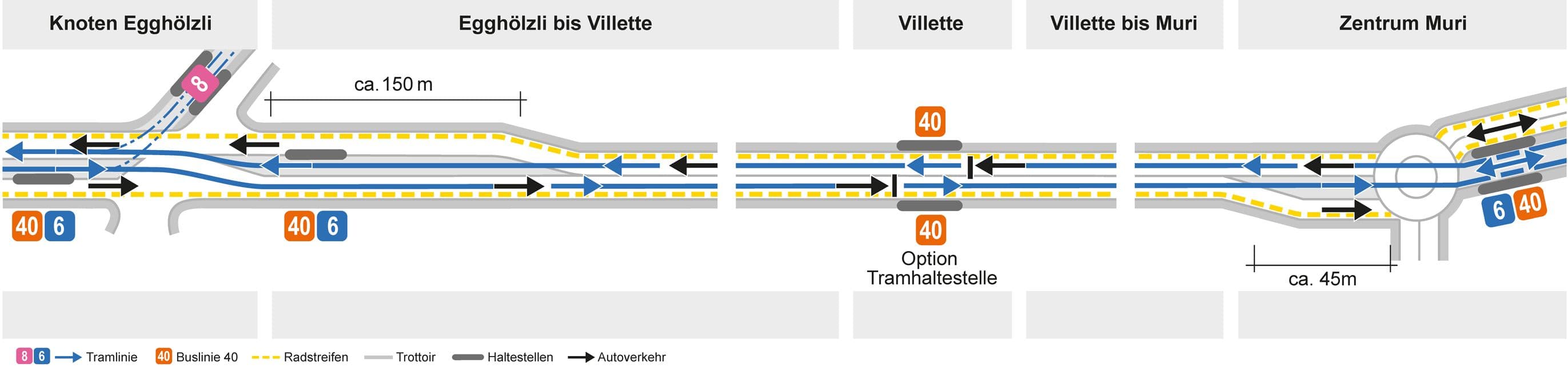 The 1.2-kilometre section of Thunstrasse between Egghölzli and Muri is now showing sizeable deficiencies: there is no continuous pavement and no cycle path markings, and the stretch has only one tram track, which limits the service on Line 6 (Fischermätteli to Worb).