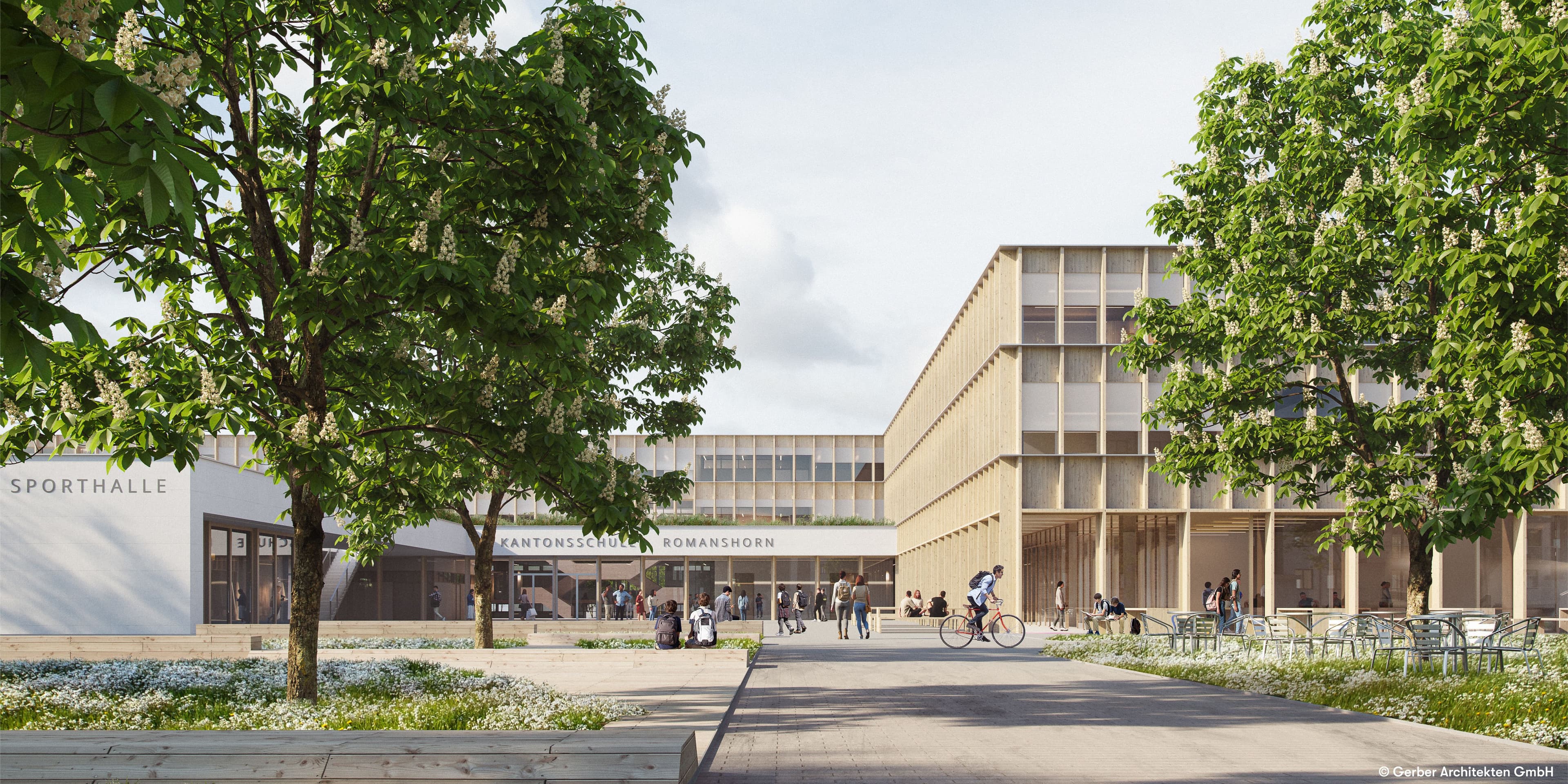 Der im Grünen gelegene Campus der Kantonsschule Romanshorn durchläuft einen Transformationsprozess: Einerseits steigt die Anzahl der Schülerschaft und andererseits verändern sich die Anforderungen an Lehr- und Lernumgebung. Obwohl die Schulanlage kontinuierlich modernisiert und erweitert wurde, erfüllen die aktuellen Gebäude die heutigen Anforderungen nicht mehr. Die Vielfalt der Unterrichtsmethoden und die wachsende Bedeutung der Digitalisierung im Unterrichtswesen führen dazu, dass der Unterricht an der Schule der Zukunft zunehmend kompetenzorientiert und selbstorganisiert stattfinden wird. Neue bauliche Konzepte müssen sich aus diesem veränderten Lehr- und Lernverständnis entwickeln.