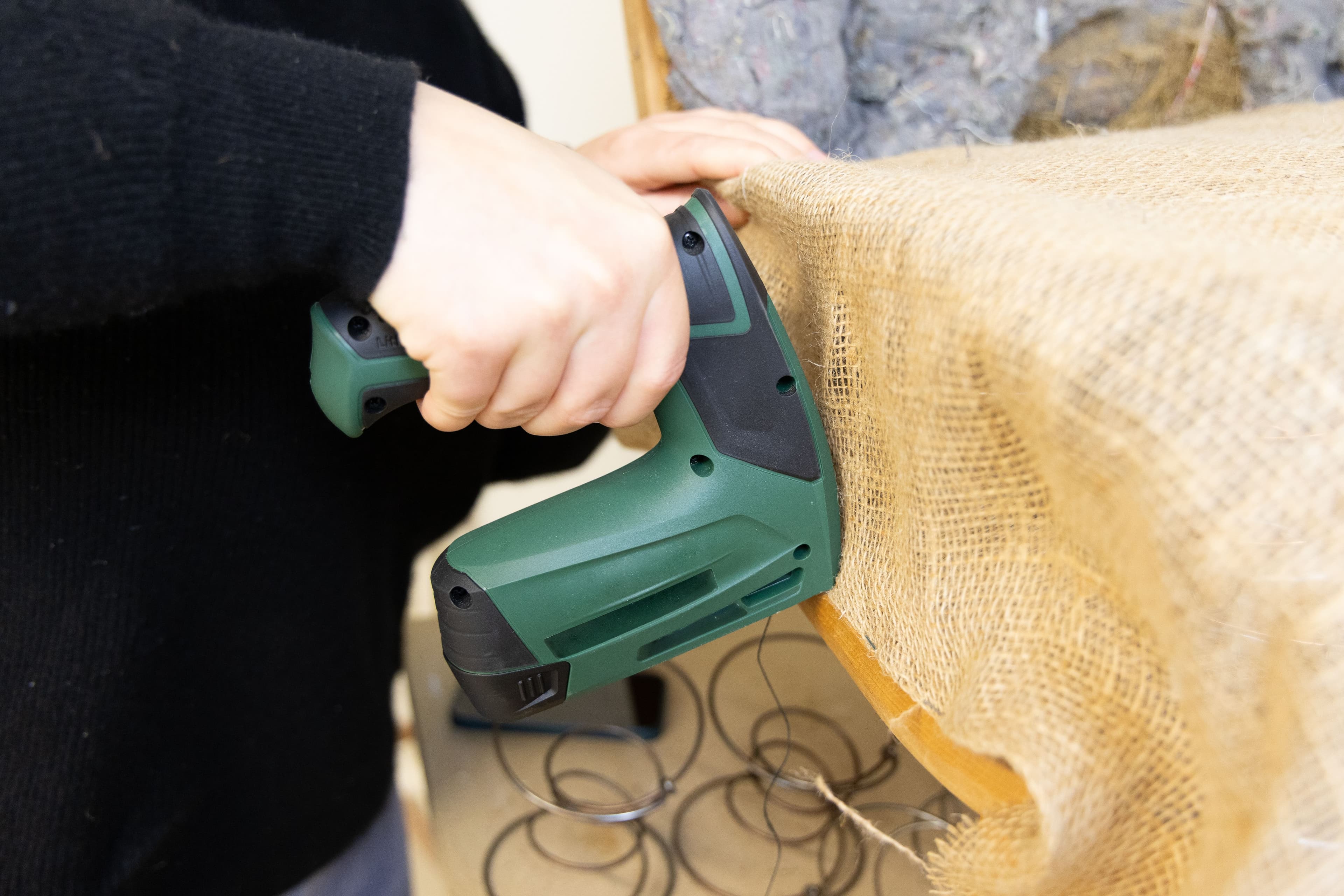 I record the original condition and photograph every step when dismantling the chair. What I remove, I replace. I reassemble/stitch the chair back together with new insides and a new outfit. I only replace material when I really need to. Everything else can stay and carry on the story.