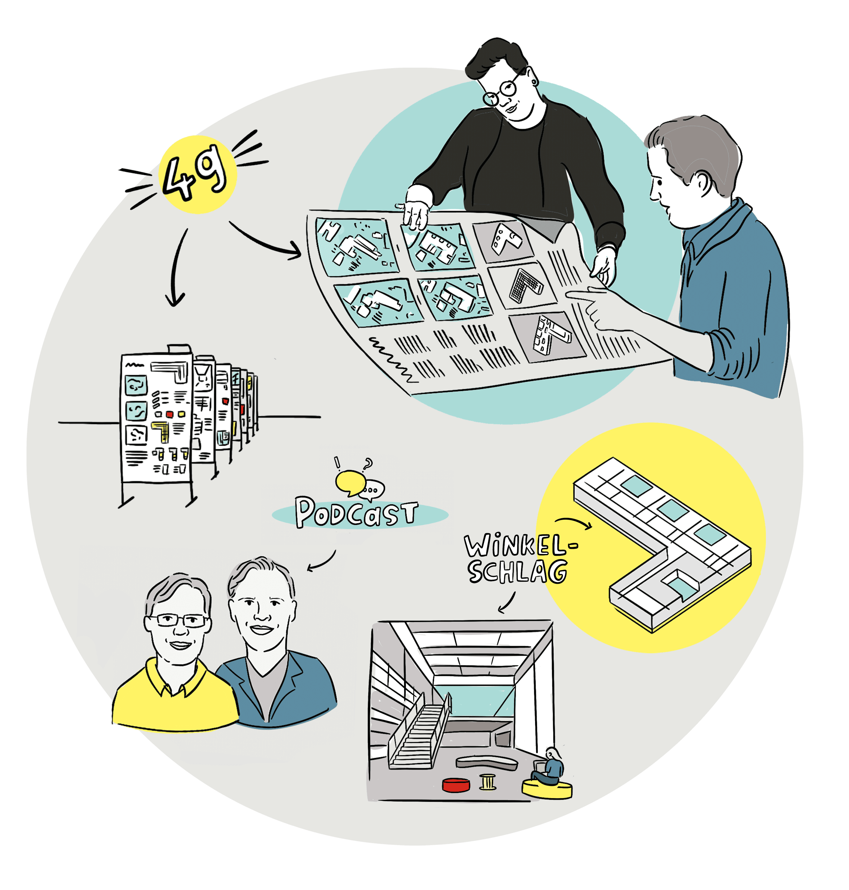 It’s worth opening up a dialogue to deal with this kind of balancing act – and we chose an unconventional approach. We recorded a conversation between the headteacher at Romanshorn high school, Stefan Schneider, and our expert for learning concepts, Andreas Sägesser. Then, we published it as a visual podcast with the help of our graphic designer Romina Pilloni and shared it with the applicants. The central starting point was the question of how learning processes could operate at the school of tomorrow. ‘We were excited to see how the architecture teams would translate these ideas into suitable structural concepts,’ says Andreas. We were impressed with the outcome: the concept of “learning landscapes” covering both collective and individual learning situations was adopted as a central theme in several contributions.