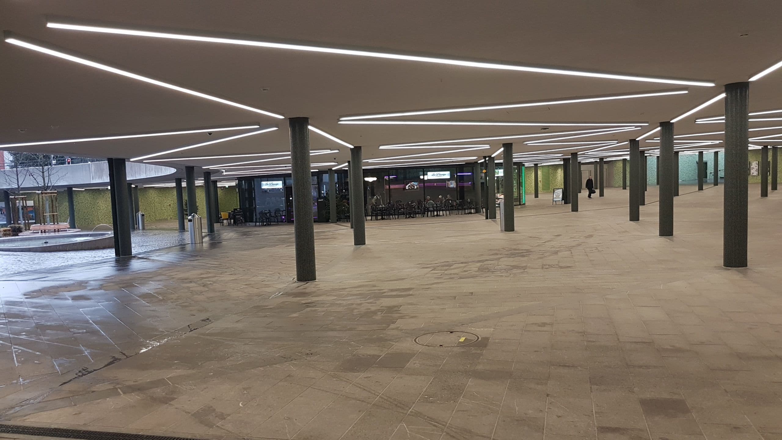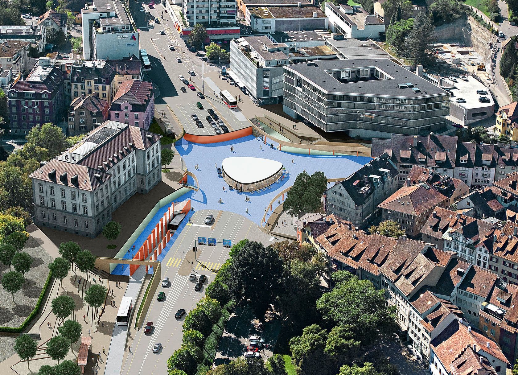 La place Schulhausplatz à Baden est le cinquième nœud de trafic le plus important de Suisse. Le TJM est d’environ 45’000 véhicules. Le projet comportait la rénovation complète de la place Schulhausplatz, de vastes travaux de construction de canalisations et de routes, un réaménagement complet et un nouveau régime de circulation. En dessous du niveau de circulation, un niveau de circulation lent pour les vélos et les piétons, ainsi que des magasins, ont été créés.